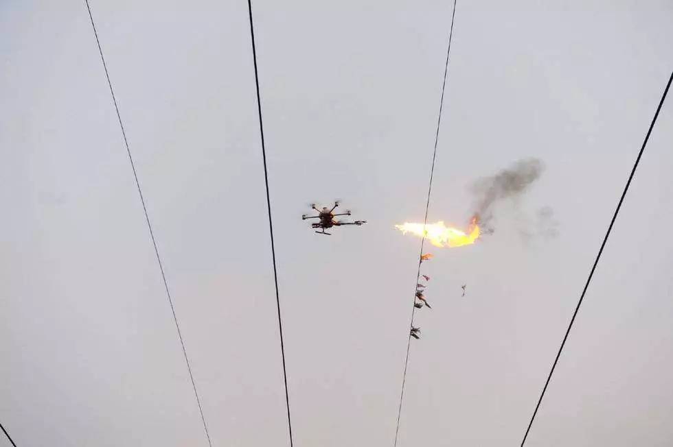 他們采用工業(yè)用無(wú)人機(jī),下面加裝了特制的噴火裝置。相對(duì)于人工除障,無(wú)人機(jī)噴火除障不但消除了高溫天氣下人工除障的不安全因素,而且不需要停電,大大提高了作業(yè)效率。
